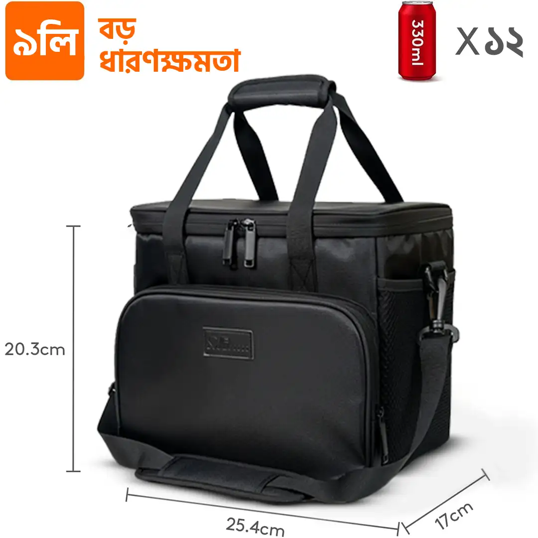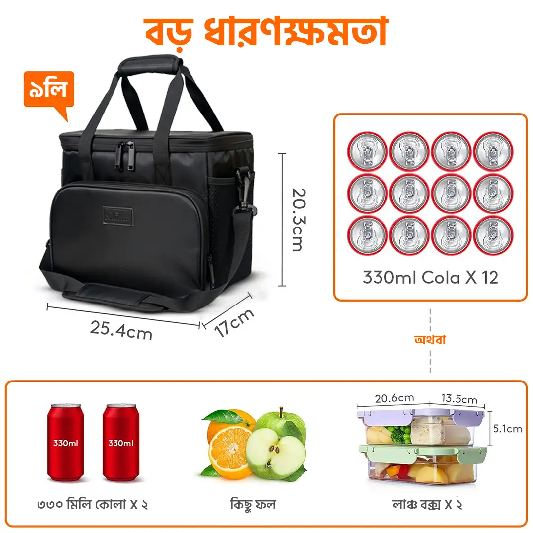 বিশাল জায়গা (Large Capacity): বাইরে থেকে কম্প্যাক্ট দেখালেও ভেতরে প্রচুর জায়গা। এতে অনায়াসেই ২-৩টি বড় টিফিন বক্স, পানির বোতল এবং ফল বা স্ন্যাকস এঁটে যাবে। এটি প্রায় ১২টি ক্যান (330ml) ধারণ করতে পারে।