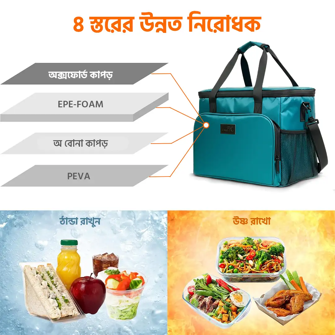 লিকপ্রুফ ও ওয়াটারপ্রুফ: ব্যাগের ভেতরের লাইনিং সম্পূর্ণ লিকপ্রুফ। ডাল বা তরকারির ঝোল পড়ে ব্যাগ মাখামাখি হওয়ার বা গাড়ির সিট নোংরা হওয়ার কোনো ভয় নেই। বাইরের কাপড়টি পানি ও ধুলোবালি প্রতিরোধক (Water-resistant Oxford fabric)।