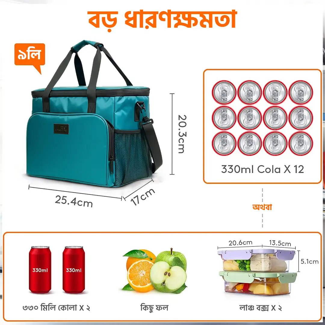 বিশাল জায়গা (Large Capacity): বাইরে থেকে কম্প্যাক্ট দেখালেও ভেতরে প্রচুর জায়গা। এতে অনায়াসেই ২-৩টি বড় টিফিন বক্স, পানির বোতল এবং ফল বা স্ন্যাকস এঁটে যাবে। এটি প্রায় ১২টি ক্যান (330ml) ধারণ করতে পারে।