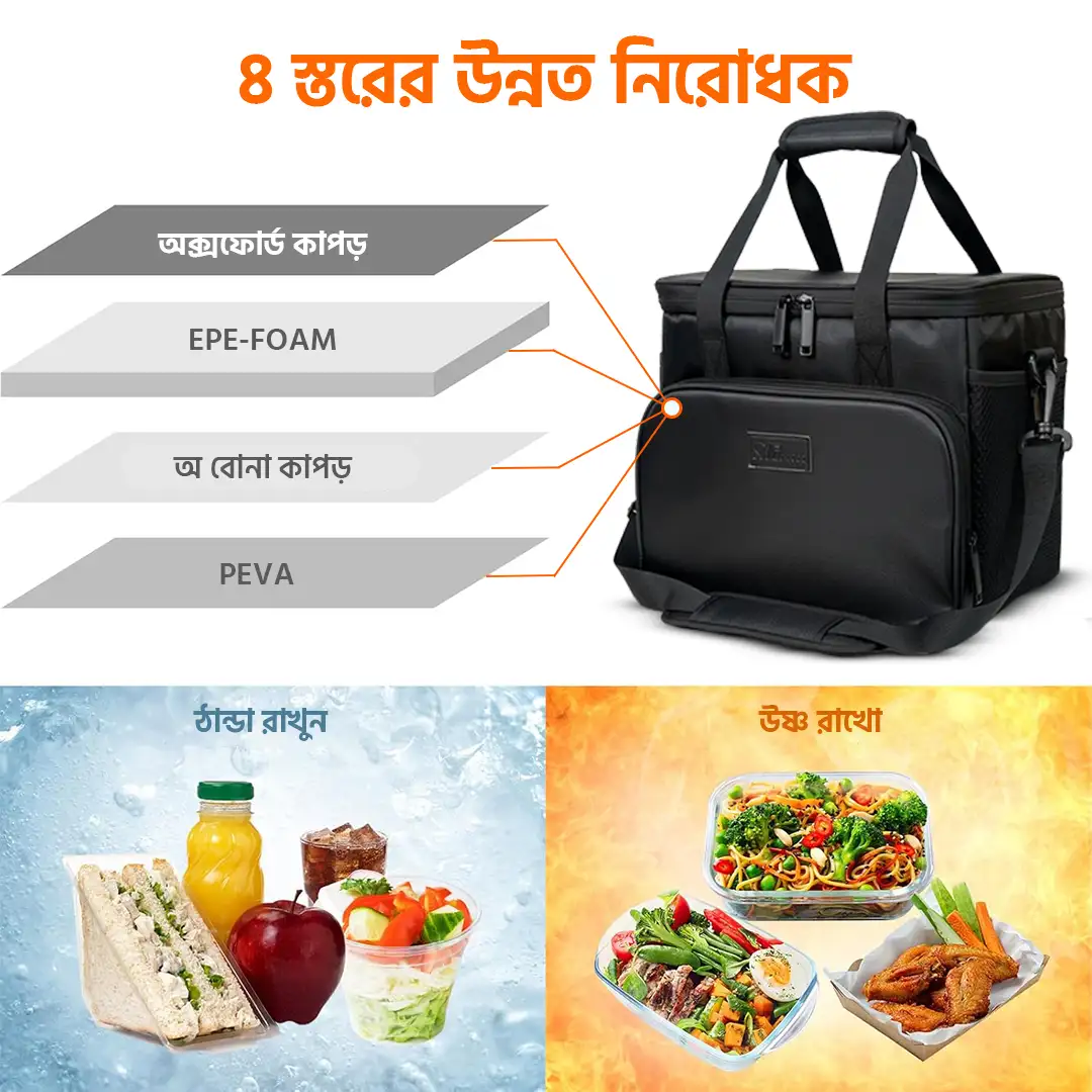 লিকপ্রুফ ও ওয়াটারপ্রুফ: ব্যাগের ভেতরের লাইনিং সম্পূর্ণ লিকপ্রুফ। ডাল বা তরকারির ঝোল পড়ে ব্যাগ মাখামাখি হওয়ার বা গাড়ির সিট নোংরা হওয়ার কোনো ভয় নেই। বাইরের কাপড়টি পানি ও ধুলোবালি প্রতিরোধক (Water-resistant Oxford fabric)।
