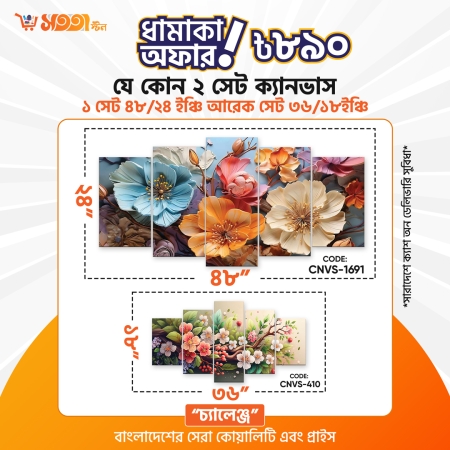 ⭐️ নোটঃ টোটাল ৫টা পার্ট মিলে ১সেট ক্যানভাস। যার ৫টা পার্ট এবং মাঝের গ্যাপ দিয়ে প্রস্থ ৪৮" ইঞ্চি এবং দৈর্ঘ্য ২৪" ইঞ্চি।